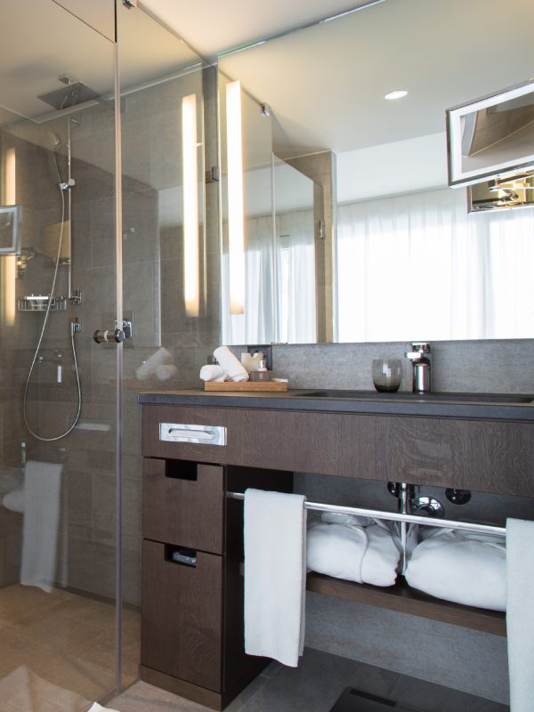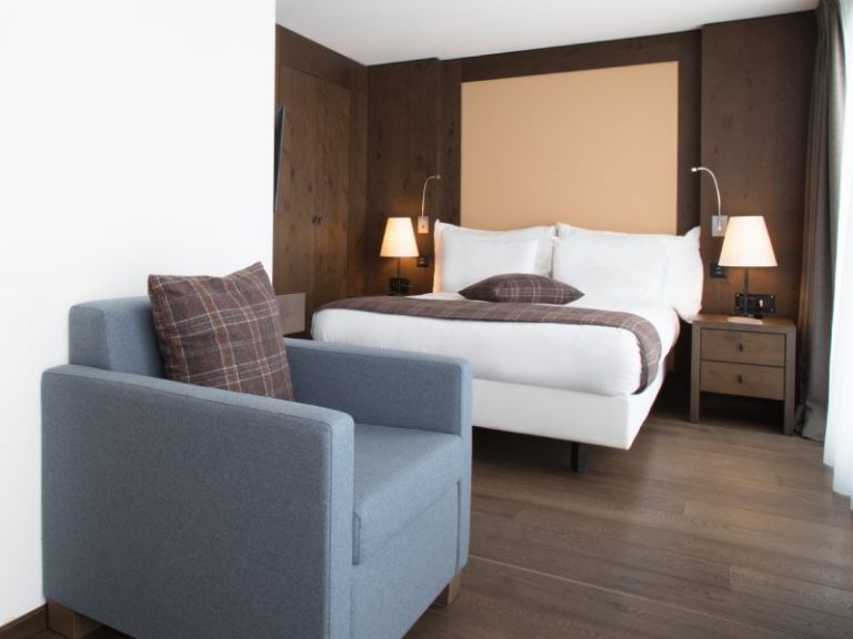 In diesem kleinen gemütlichen Zimmer können Sie so richtig entspannen. Alles trägt zu Ihrem Wohlbefinden bei: das komfortable Doppelbett von 140 cm, die harmonischen Farben und Materialien sowie das praktisch-elegante Badezimmer. Alle Zimmer haben eine Terrasse mit Blick auf den Wald und laden in die Natur ein.